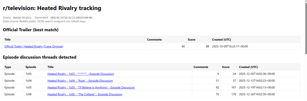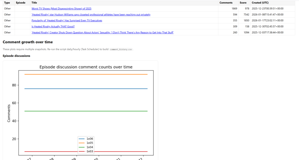 The Heated Rivalry tracker is a Python script that queries r/television via Reddit’s public JSON search, tags posts as episode discussions (e.g., 1x01/1x02), an official trailer thread, or other mentions, and then captures each post’s num_comments, score, and permalink into CSV outputs.